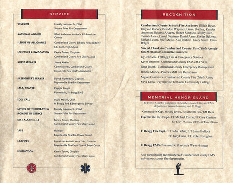 All are invited to attend this annual memorial service to honor Firefighters and EMS workers who have sacrificed their lives serving the citizens of Cumberland County and Fort Liberty.